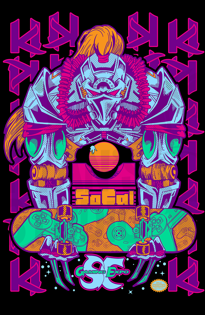 2024's So Cal Gaming Expo design that was used on their exclusive VIP shirts and the show's badges. Every year we try to blend a video game property with that California vibe of skateboarding! This year's theme was Killer Instinct!