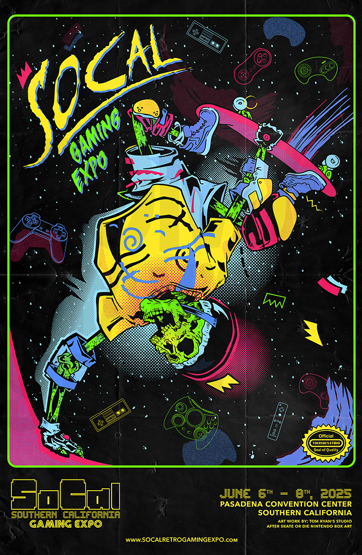 2025's So Cal Gaming Expo design that was used on their exclusive VIP shirts and the show's badges. Every year we try to blend a video game property with that California vibe of skateboarding! This year's theme was Skate or Die!